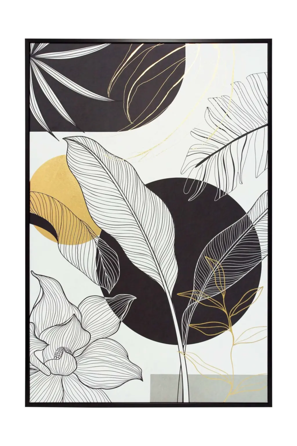 Un elegante lienzo en tela sintética de poliéster con detalles dorados y marco de poliestireno negro, ideal para agregar un toque moderno a cualquier espacio. Incluye herrajes para colgar.