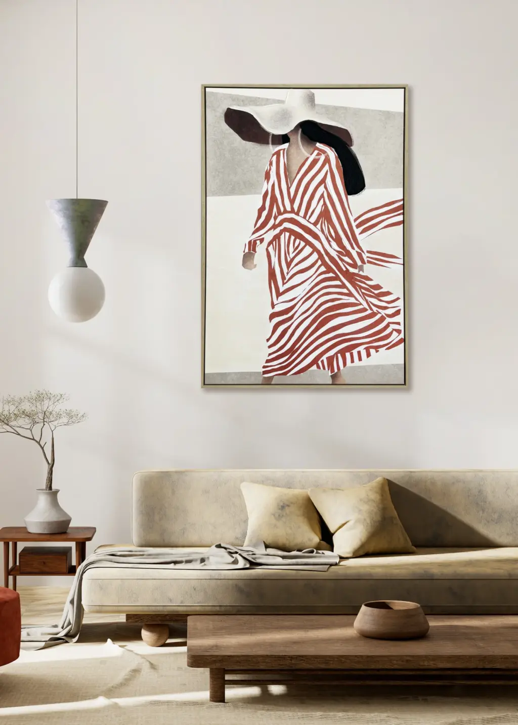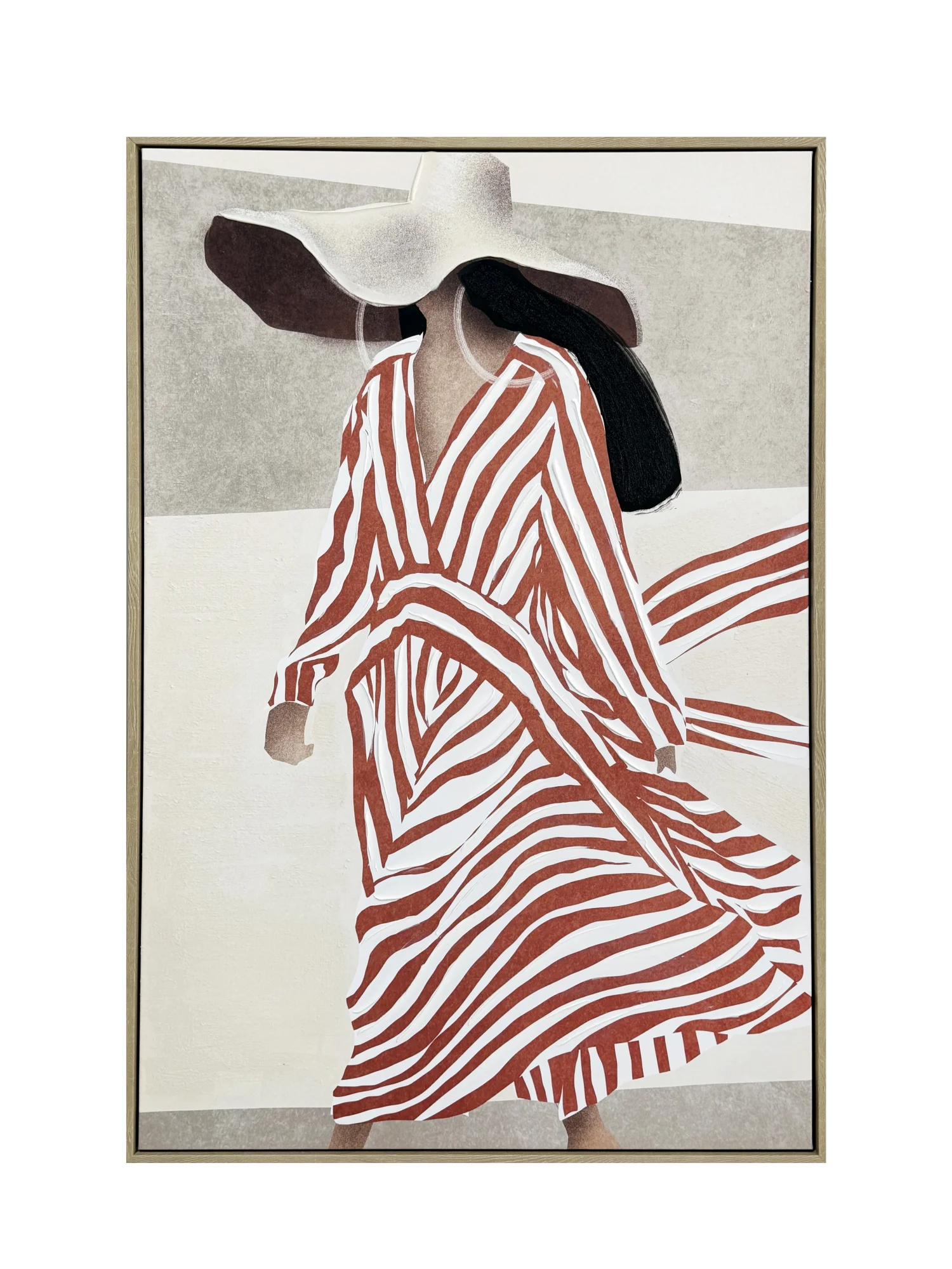 Impresión sobre lienzo con retoque en relieve y cuadro en MDF. Diseño de mujer en tonos neutros con un toque terracota que da identidad a cualquier espacio.