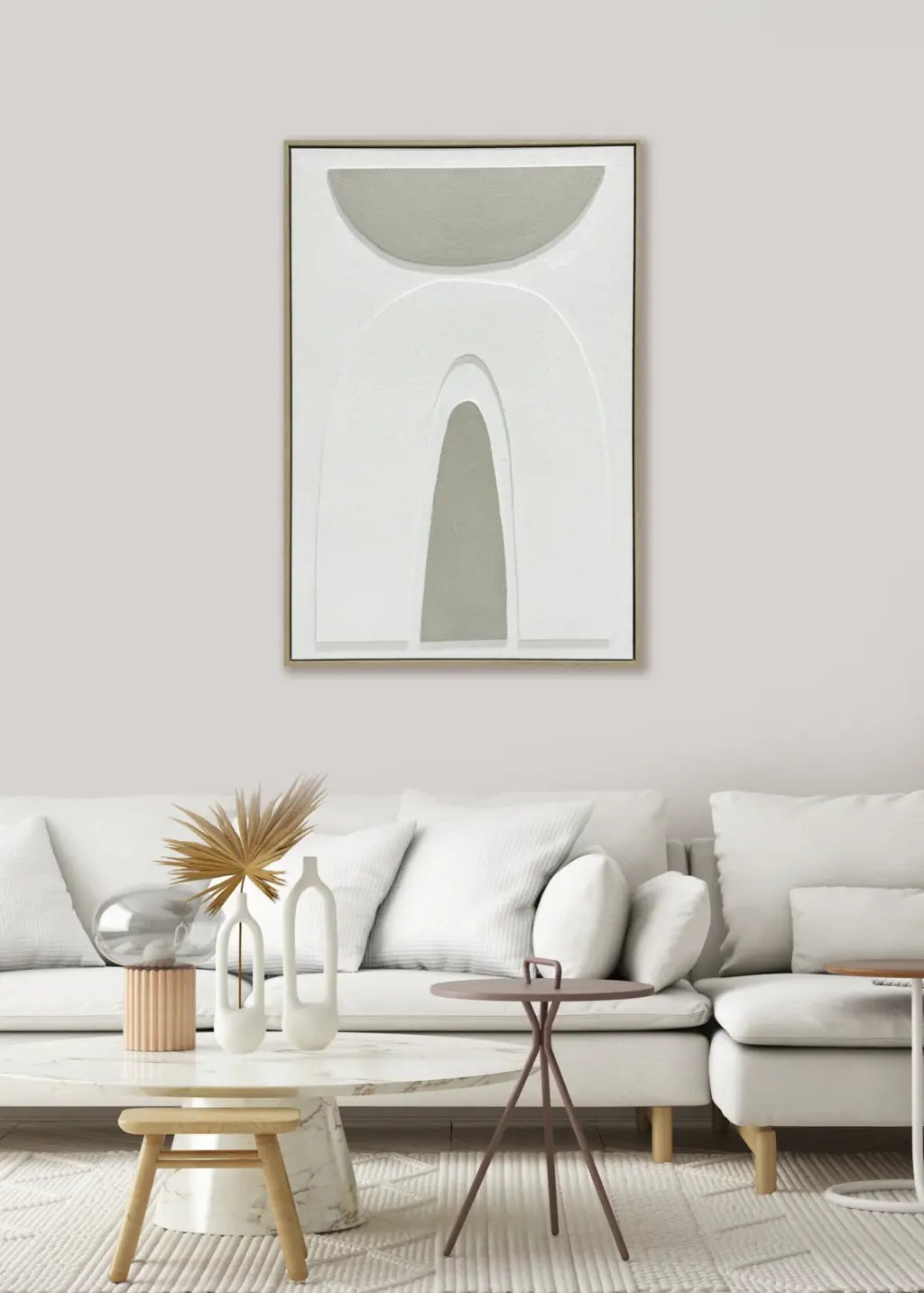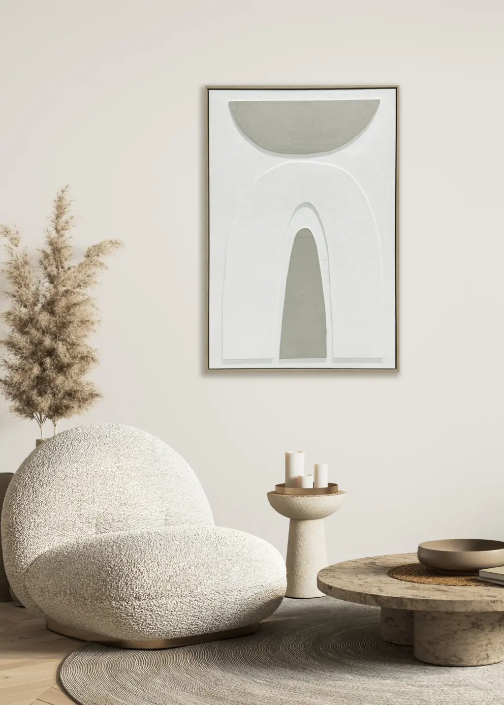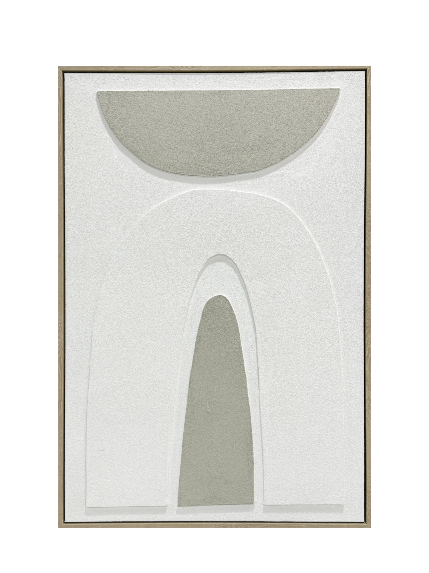Cuadro abstracto en tonos neutros con marco en MDF. Diseño con formas geométricas suaves y relieve que crea un efecto 3D, de estilo moderno y minimalista.