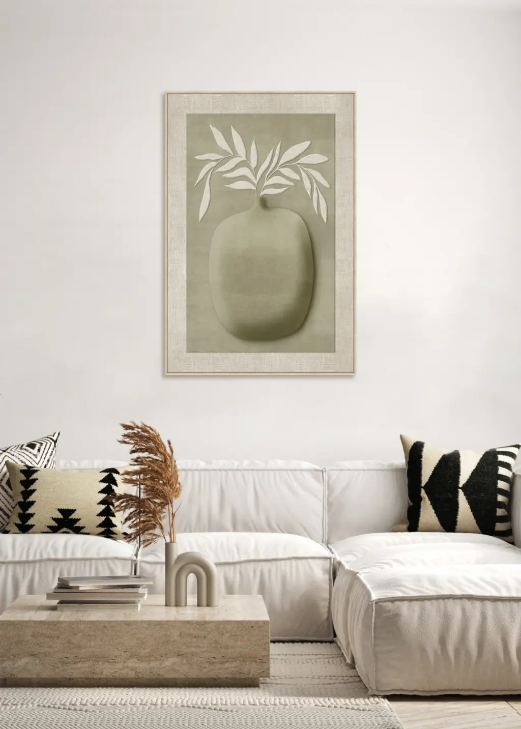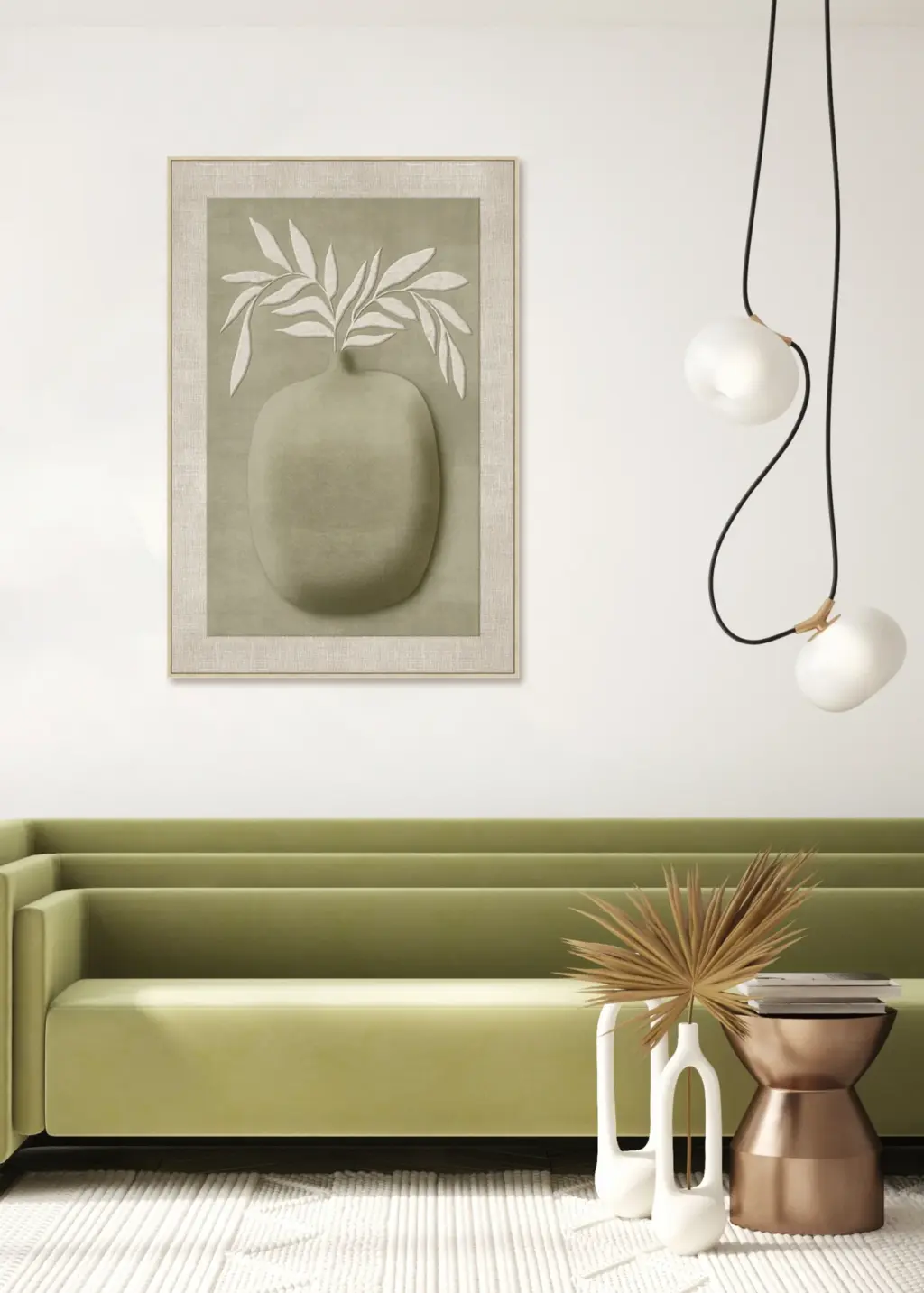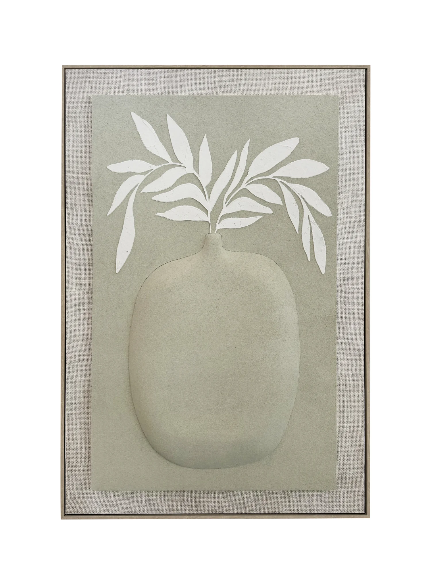 Esta pieza presenta una silueta orgánica de jarrón en relieve con hojas blancas texturizadas que sobresalen sobre un fondo verde oliva suave. El conjunto está montado sobre una base de lino texturizado y un marco de madera, logrando un volumen tridimensional refinado y natural.