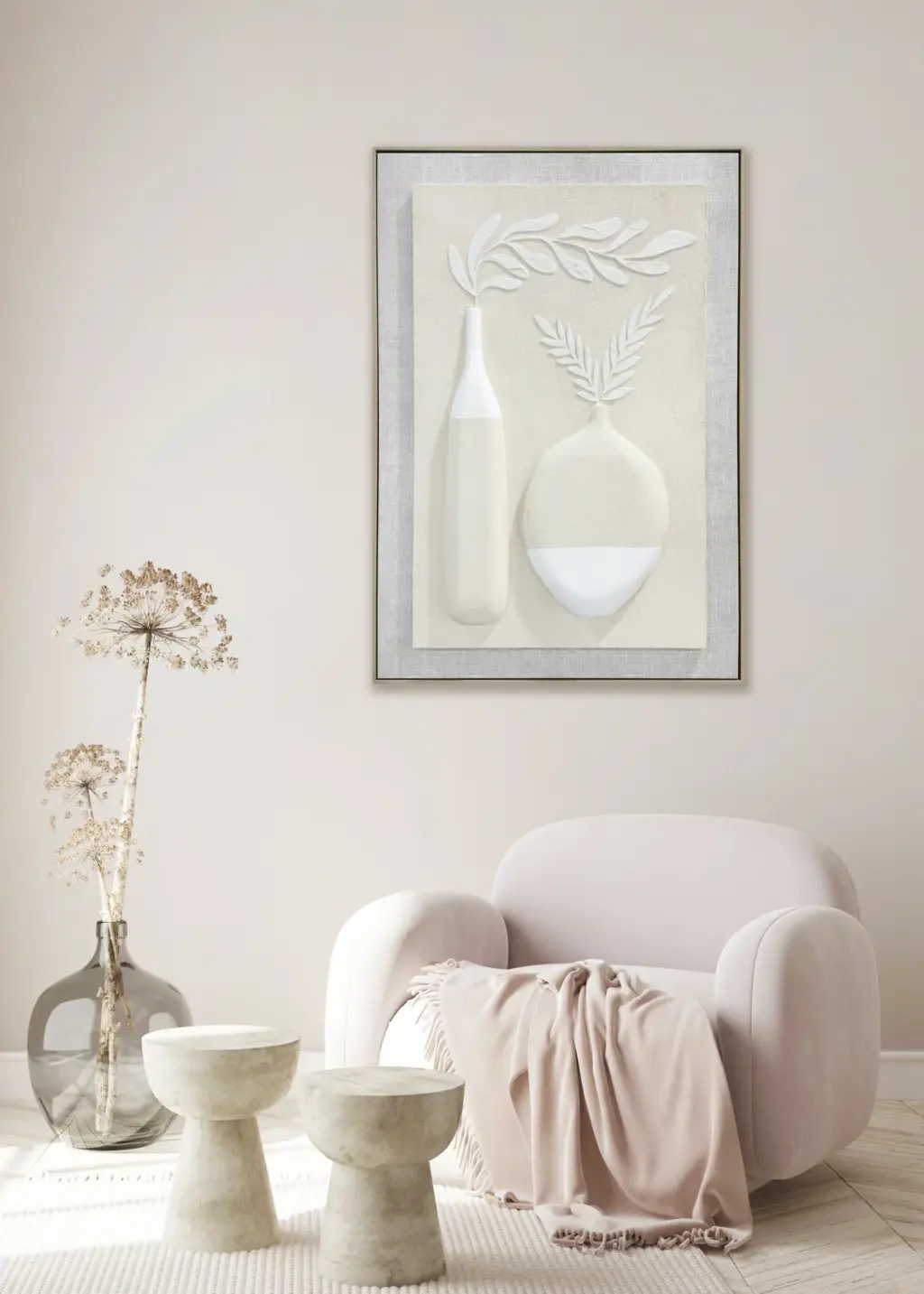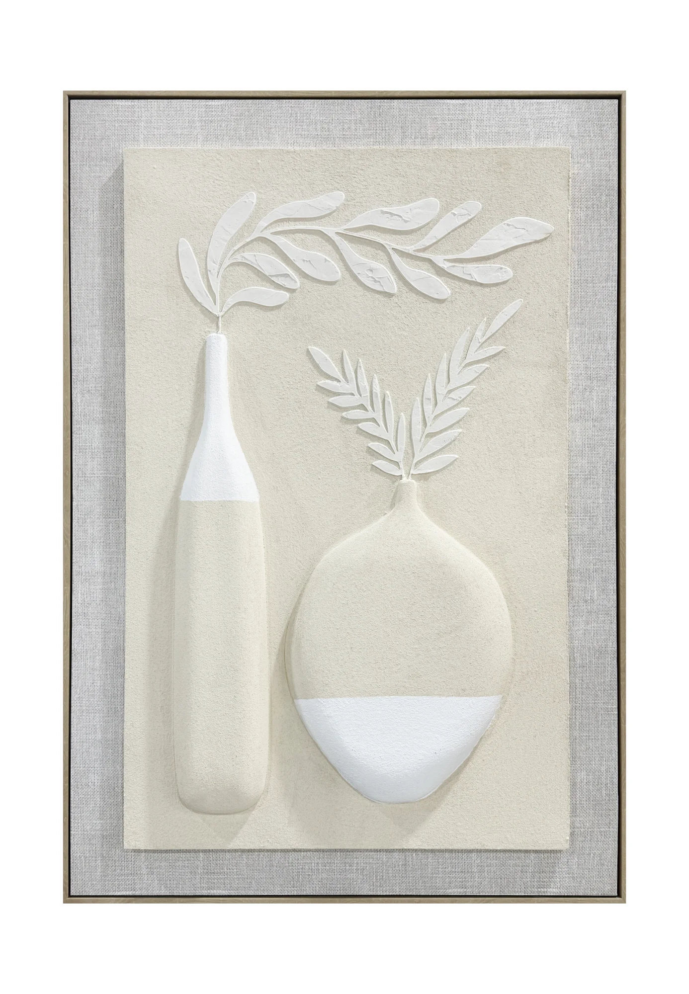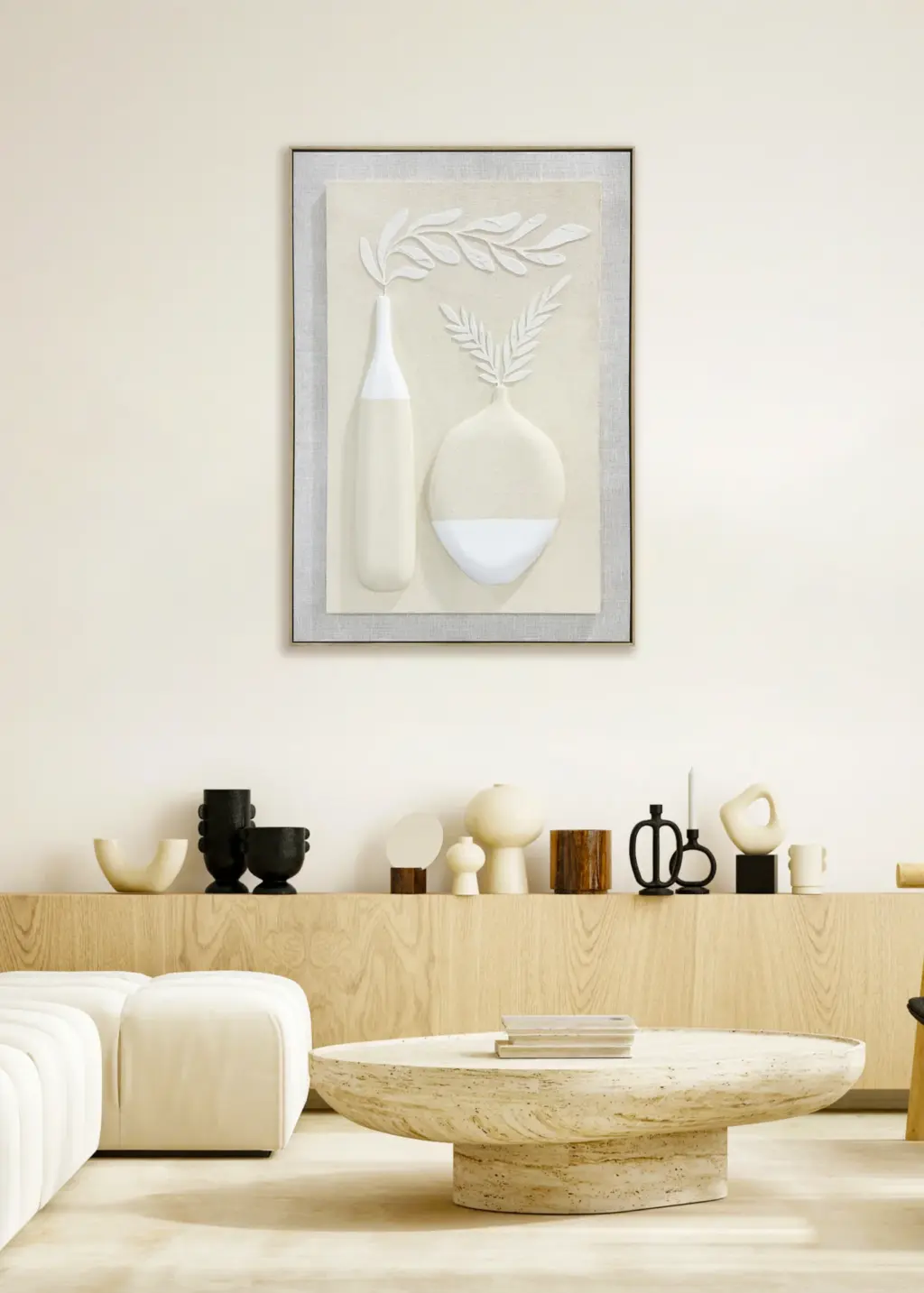 Composición artística de jarrones en relieve con detalles en blanco y crema que resaltan sobre una base texturizada de lino y un marco de madera natural. Las formas orgánicas y las hojas con textura crean un marcado efecto tridimensional.