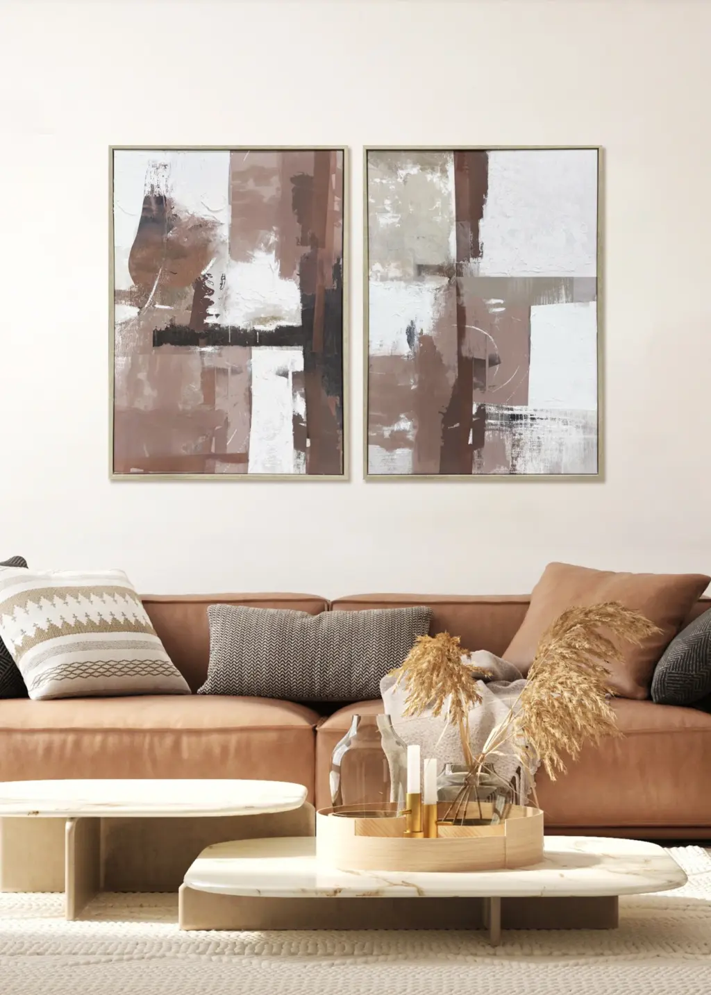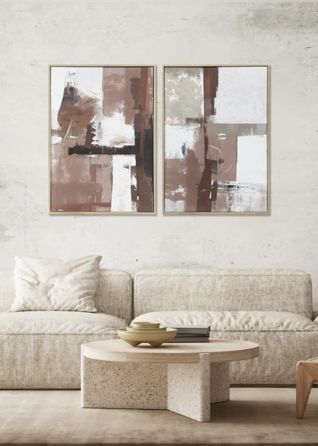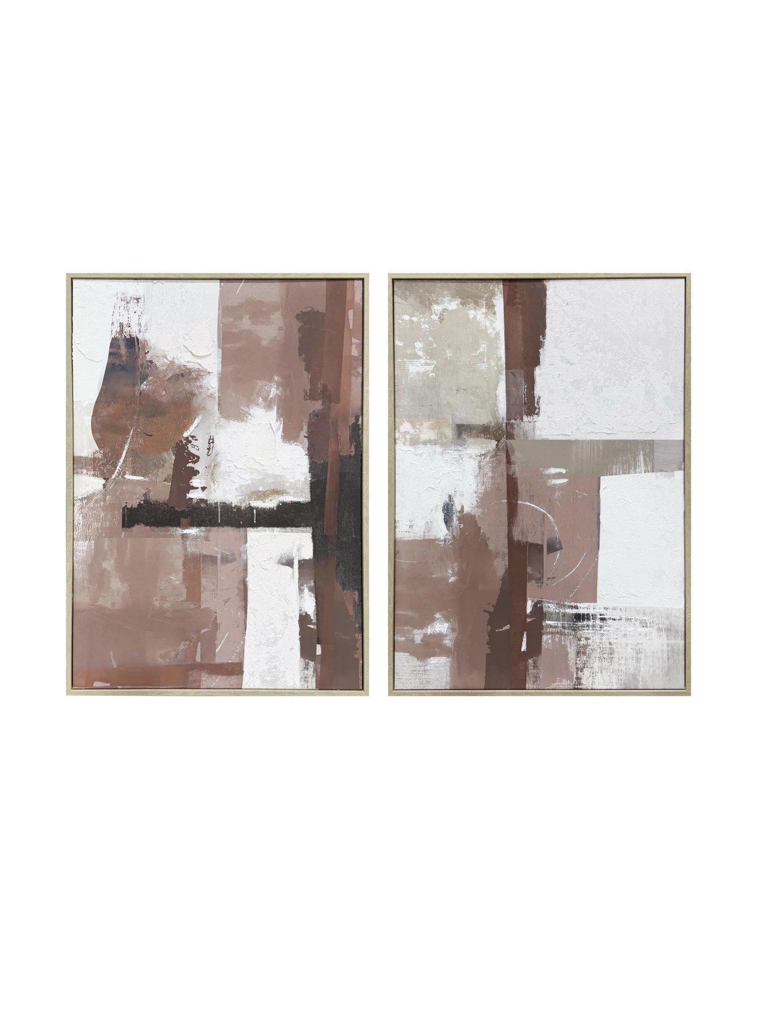 Dúo de lienzos abstractos con una base de impresión y detalles retocados a mano, destacando por sus pinceladas con relieve y texturas de estuco.