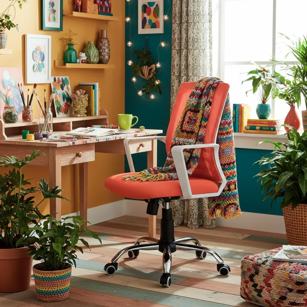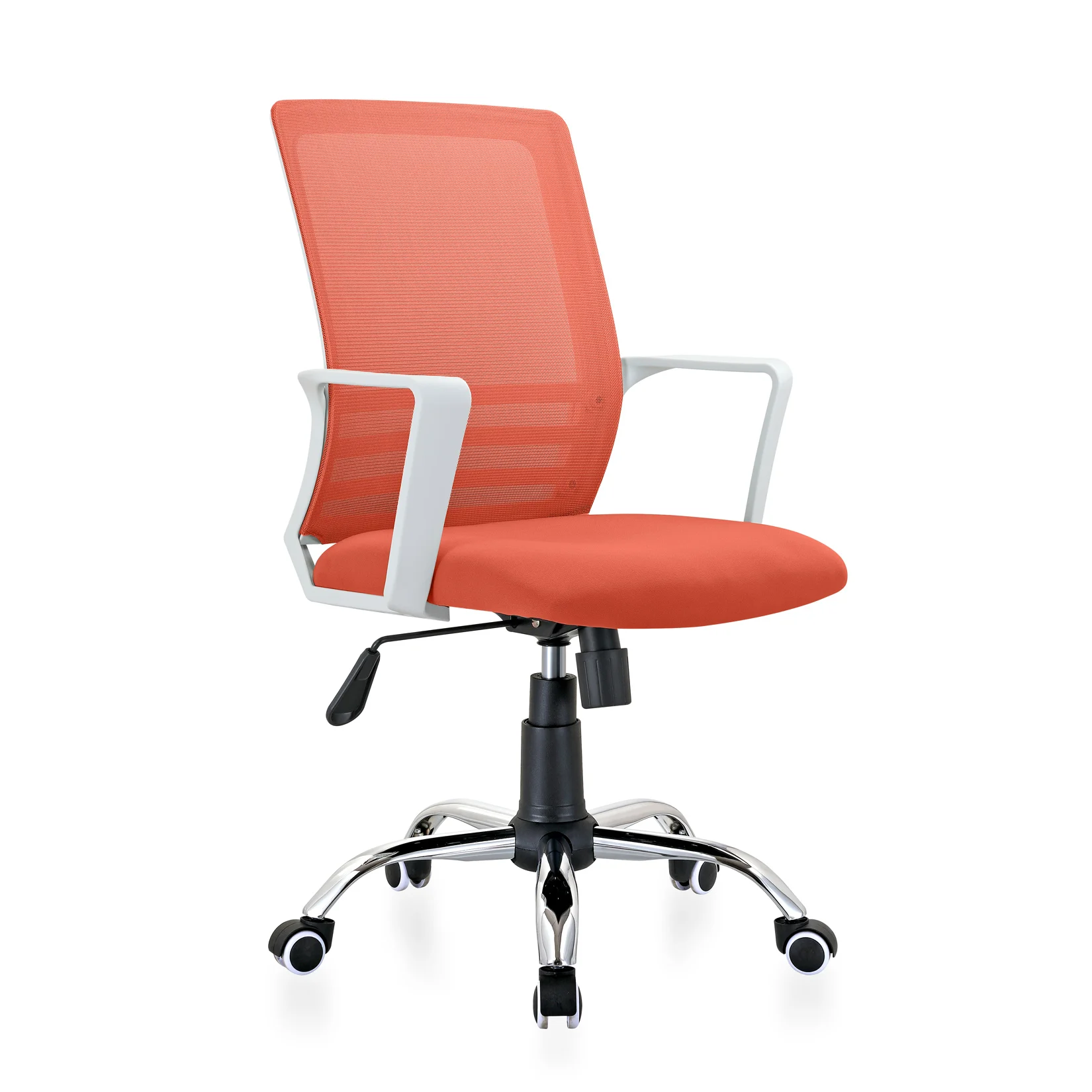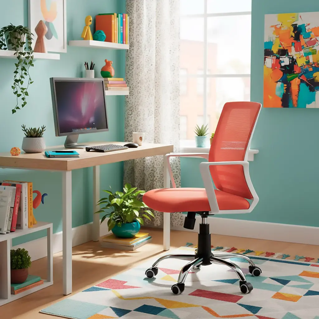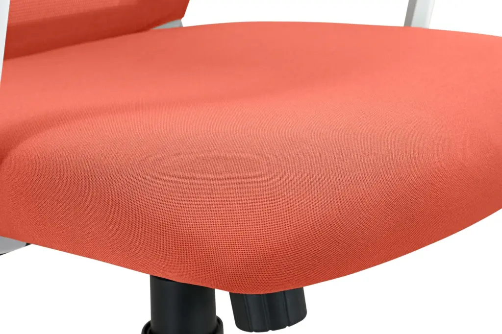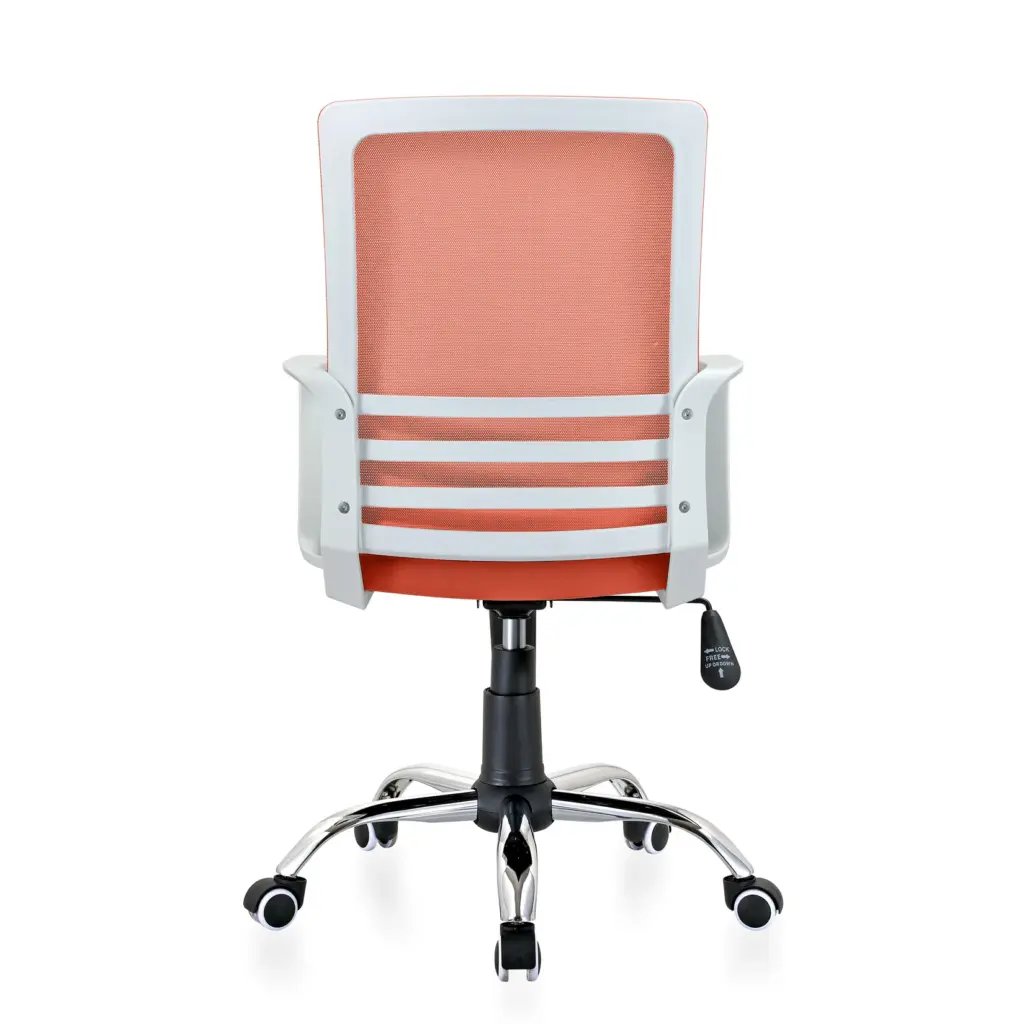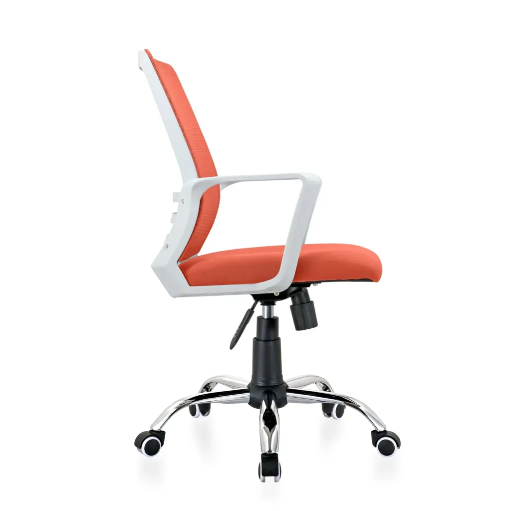 Esta silla en color terracota ofrece un diseño elegante con respaldo de malla transpirable y estructura blanca en los apoyabrazos. Es regulable en altura, cuenta con una base cromada de gran resistencia y ruedas de doble giro para un movimiento fluido.