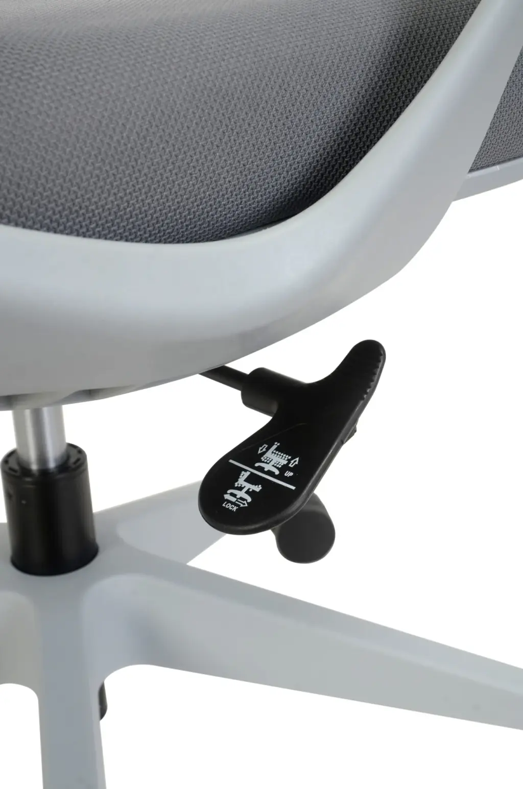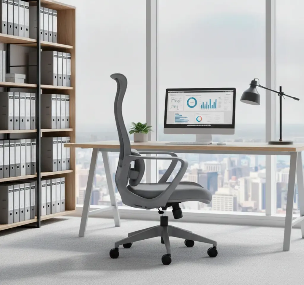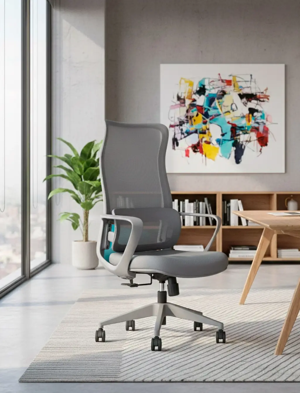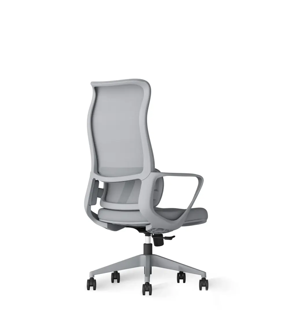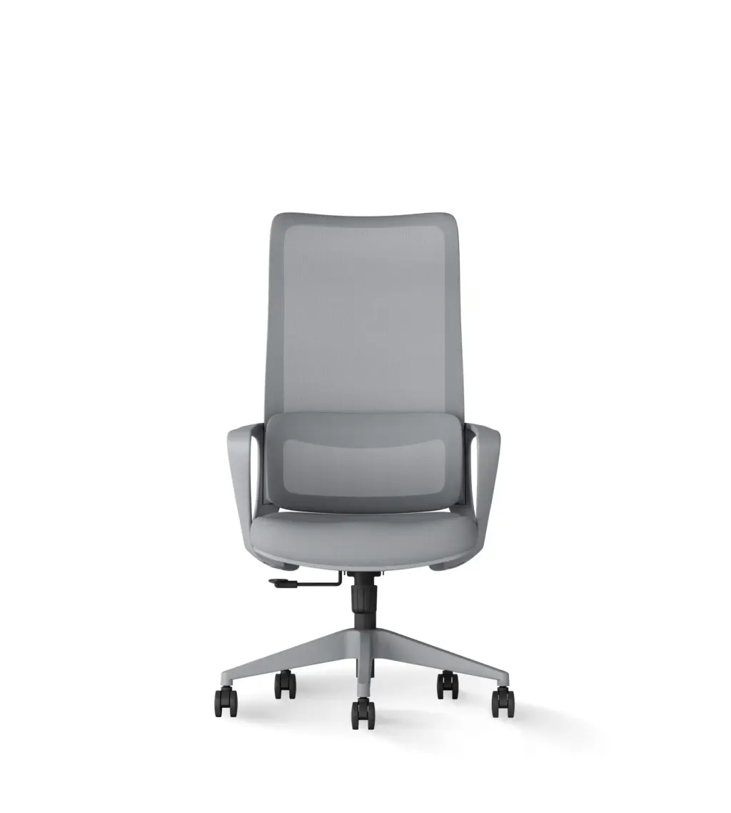Esta silla de oficina en color gris destaca por su diseño moderno y distintivo, con un respaldo alto de malla transpirable que ofrece un soporte lumbar ajustable. Cuenta con ajuste de altura, reposabrazos integrados y una base de cinco ruedas para una movilidad suave.