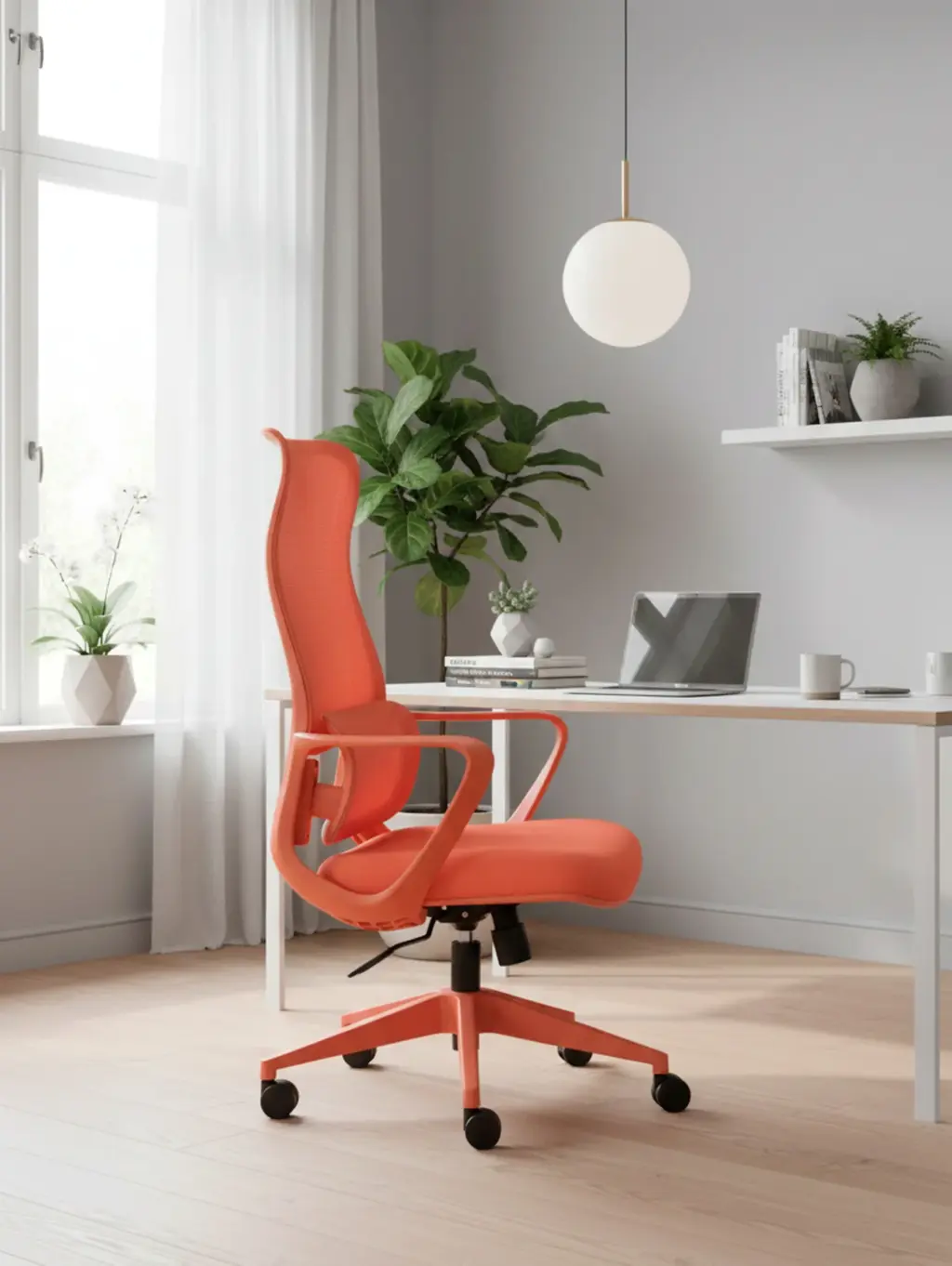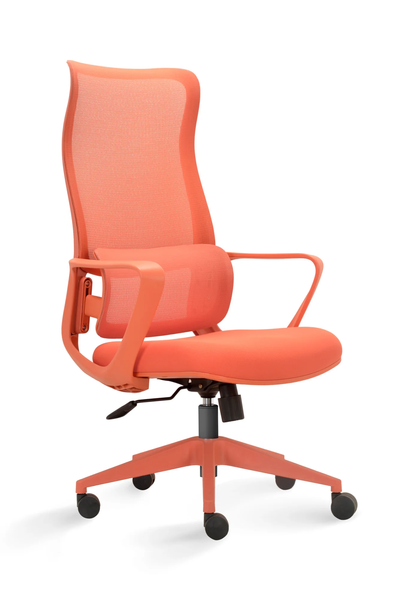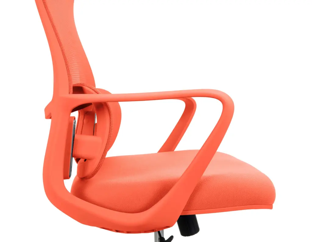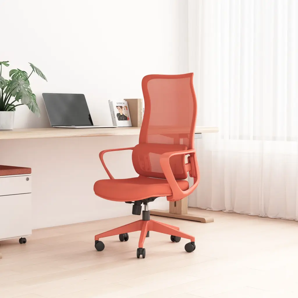Esta silla de oficina en color naranja destaca por su diseño moderno y distintivo, con un respaldo alto de malla transpirable que ofrece un soporte lumbar ajustable. Cuenta con ajuste de altura, reposabrazos integrados y una base de cinco ruedas para una movilidad suave.