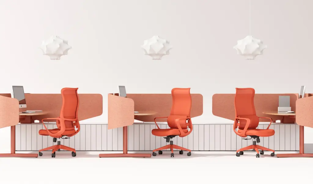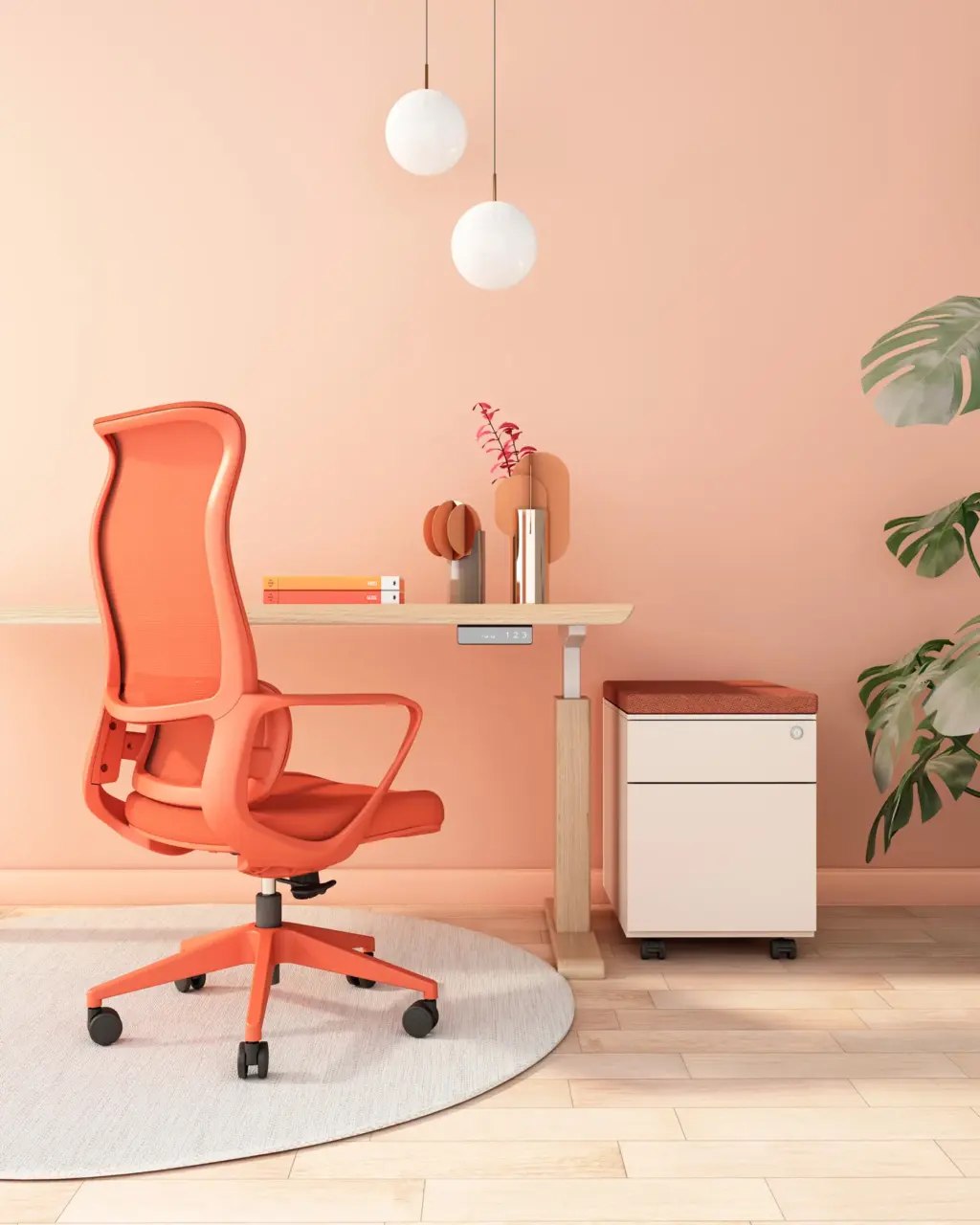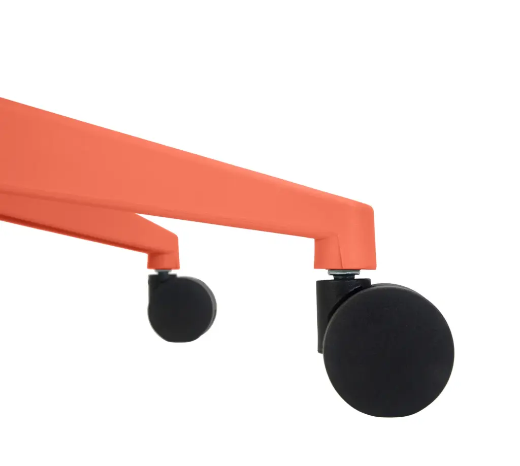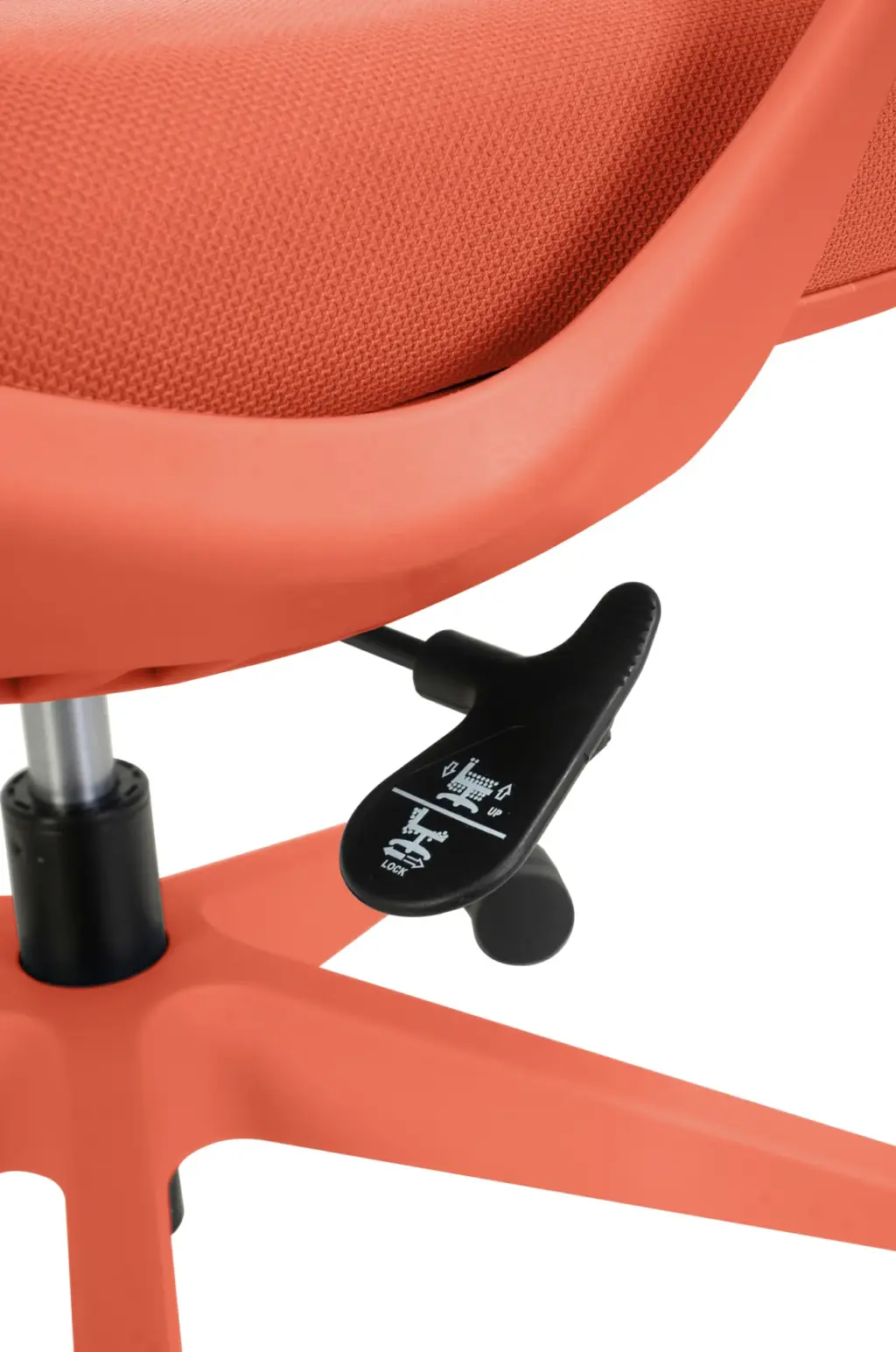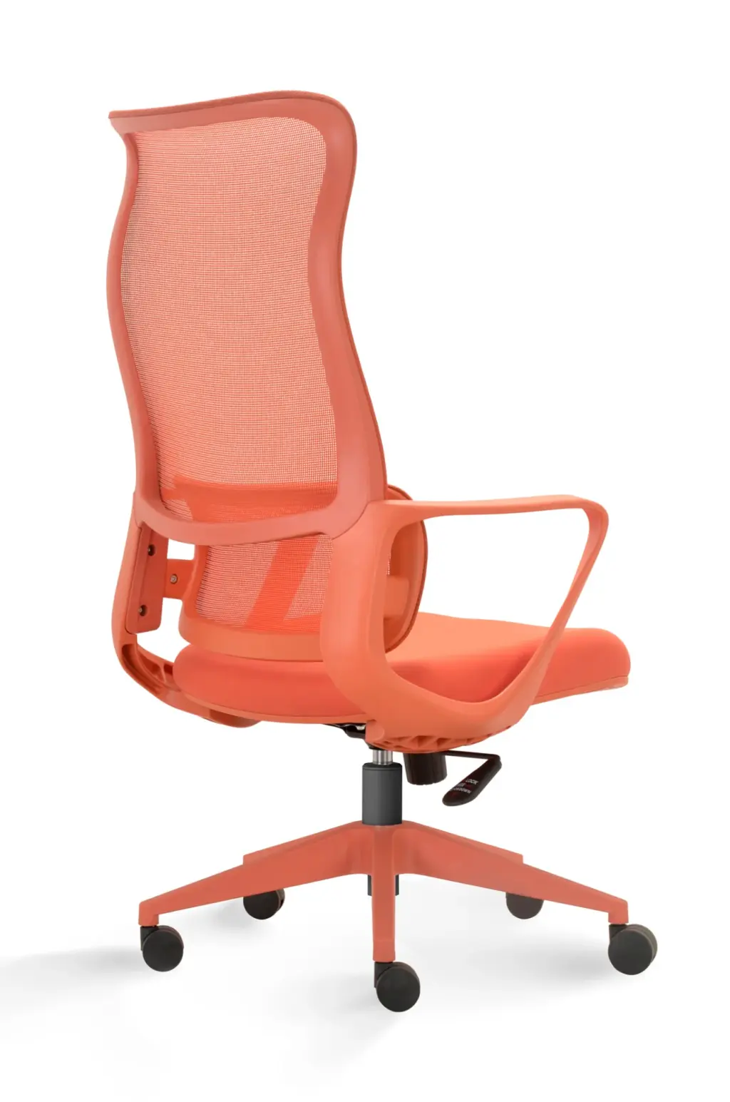 Esta silla de oficina en color naranja destaca por su diseño moderno y distintivo, con un respaldo alto de malla transpirable que ofrece un soporte lumbar ajustable. Cuenta con ajuste de altura, reposabrazos integrados y una base de cinco ruedas para una movilidad suave.