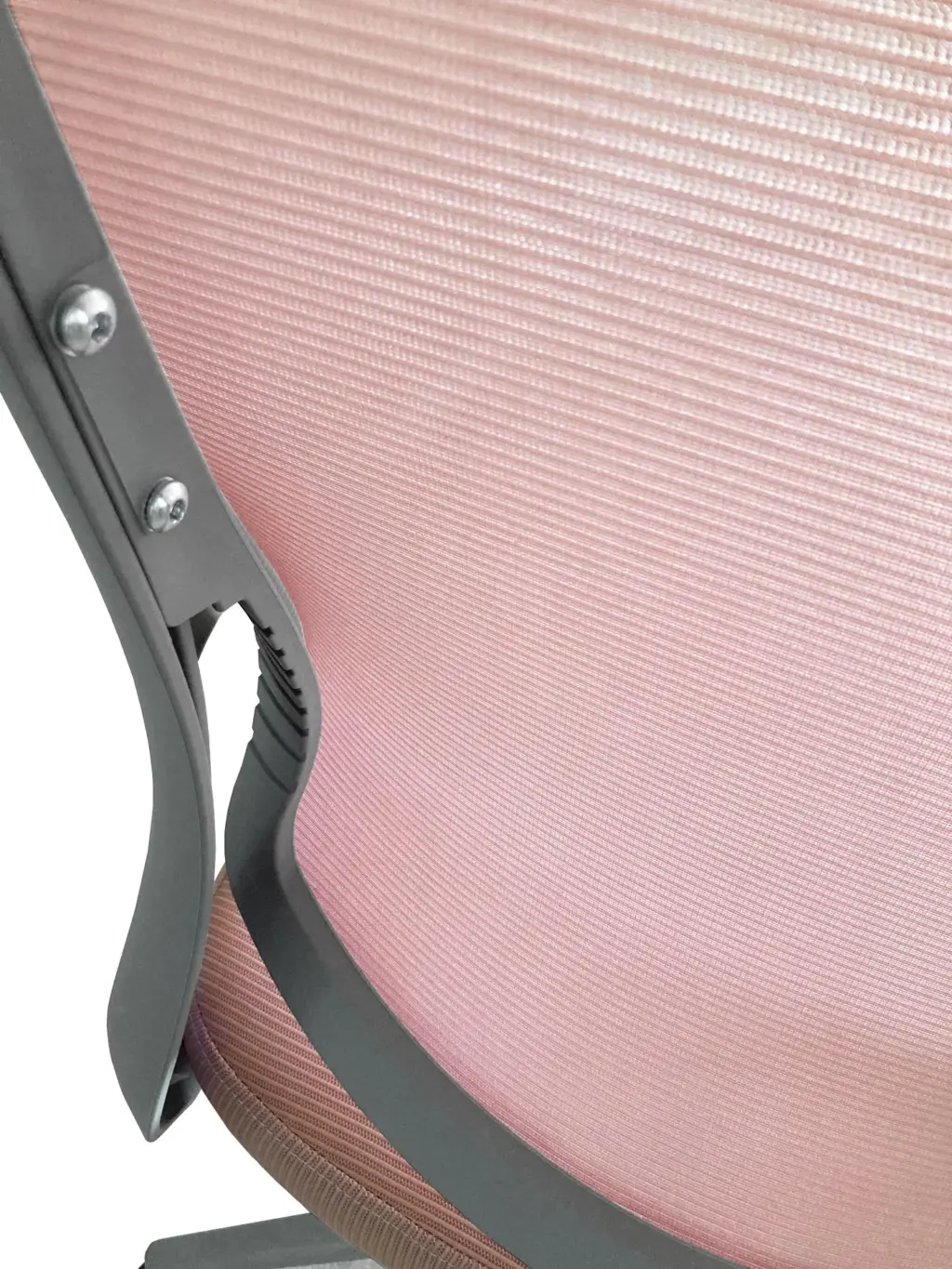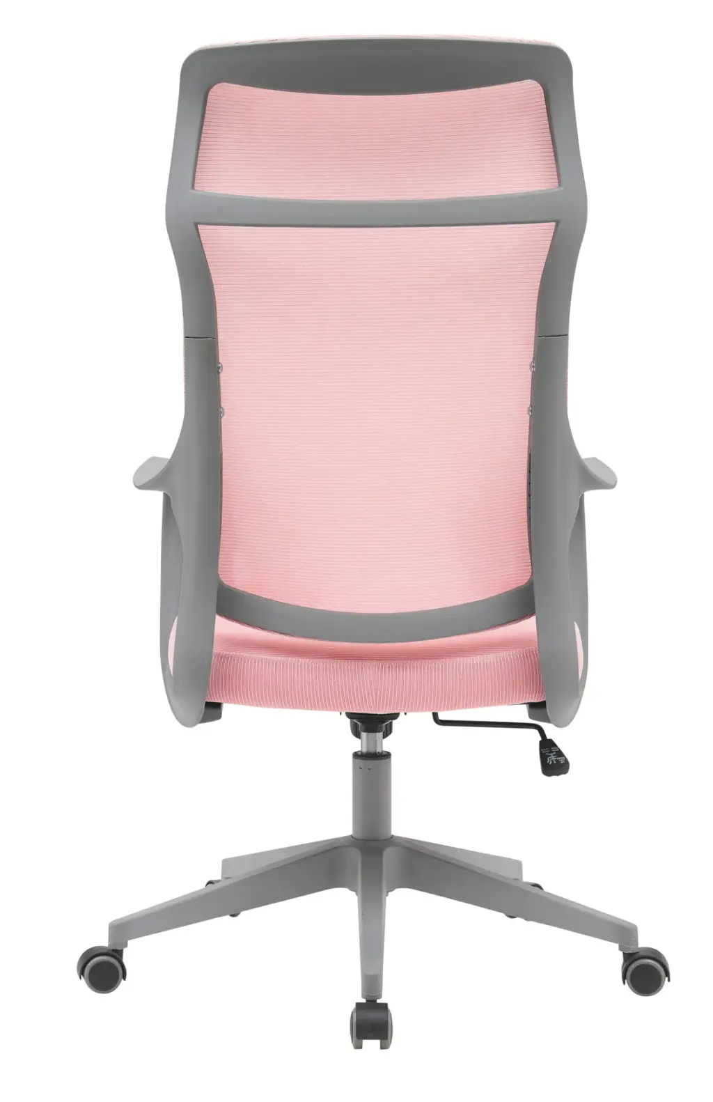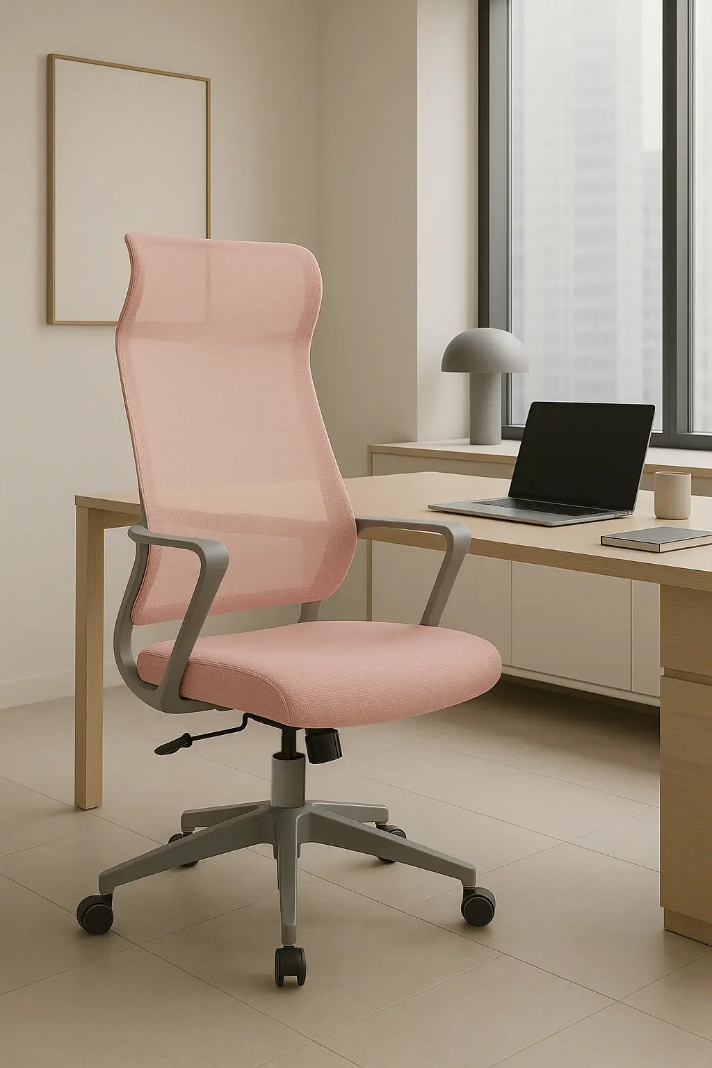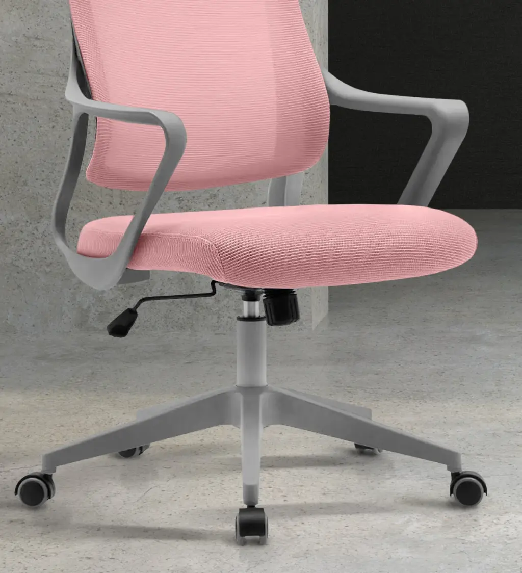 Silla de oficina en textil rosa con respaldo alto transpirable. Cuenta con sistema basculante con opción de bloqueo y una rueda para ajustar la dureza del balanceo, adaptándose a las preferencias del usuario. Su diseño ergonómico incluye un reposacabezas integrado para mayor confort. La estructura y base están fabricadas en nylon inyectado, mientras que las ruedas de silicona son aptas para parquet y otros tipos de suelo.